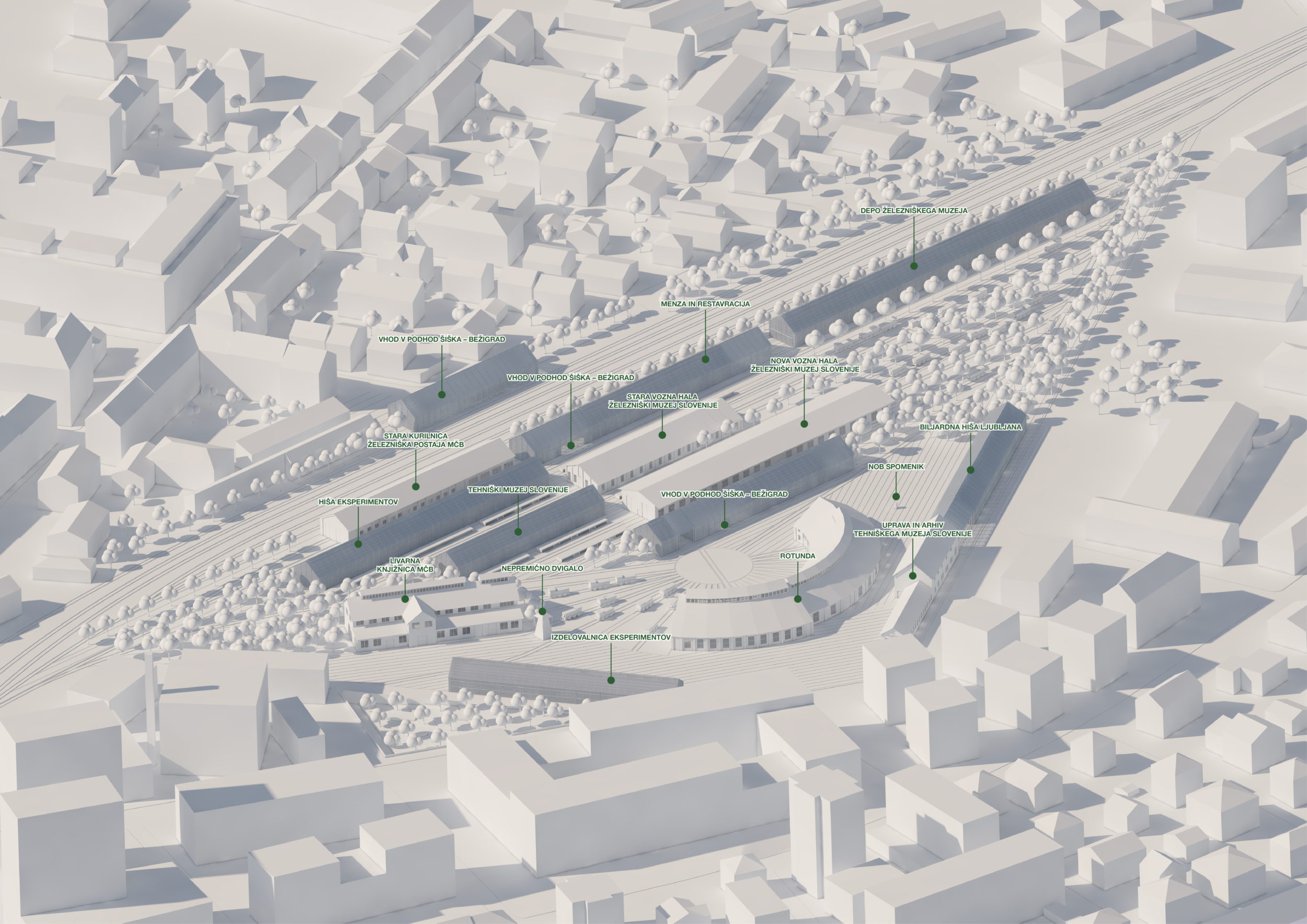 Muzejska četrt je zasnovana kot parkovna ureditev z več muzejskimi objekti. Program Železniškega muzeja Bežigrad je umeščen v prenovljene objekte industrijske dediščine. Za Tehnični muzej Slovenije, Hišo eksperimentov in spremljevalni program pa načrtujem novo zgrajene objekte, ki sledijo geometriji obstoječih objektov.
