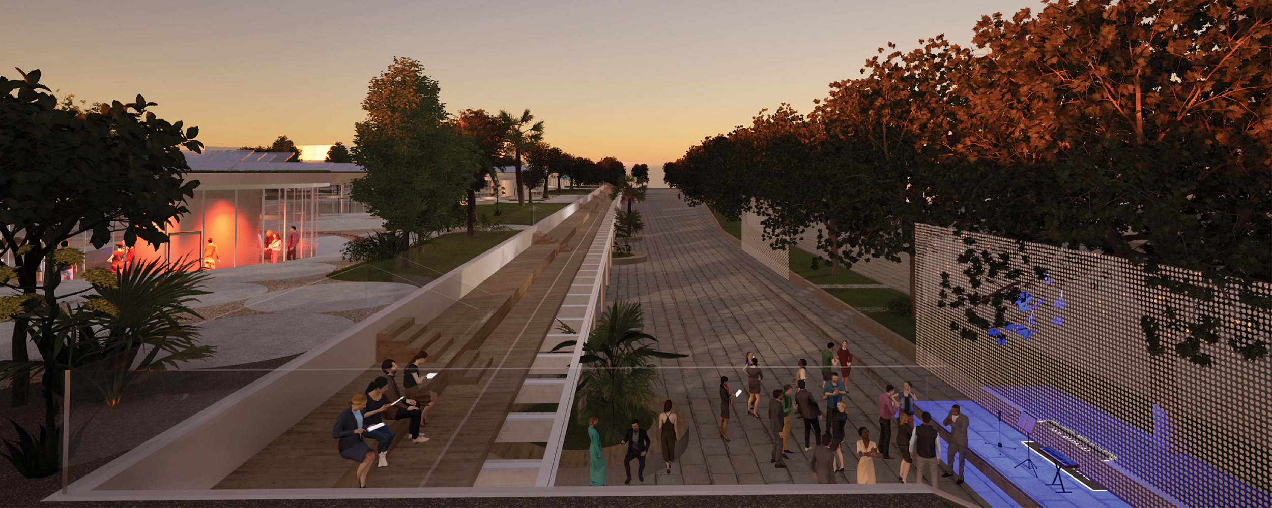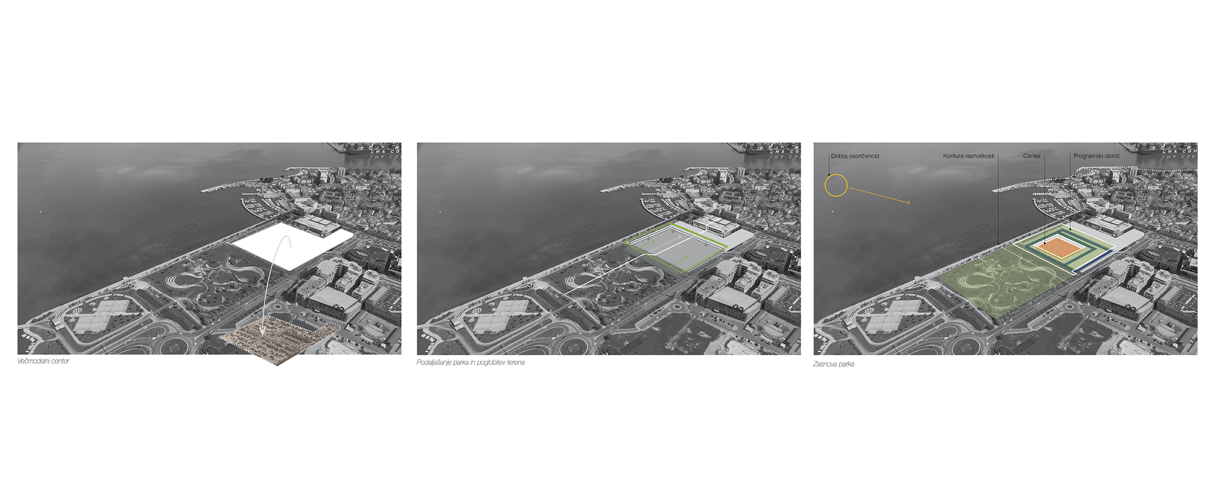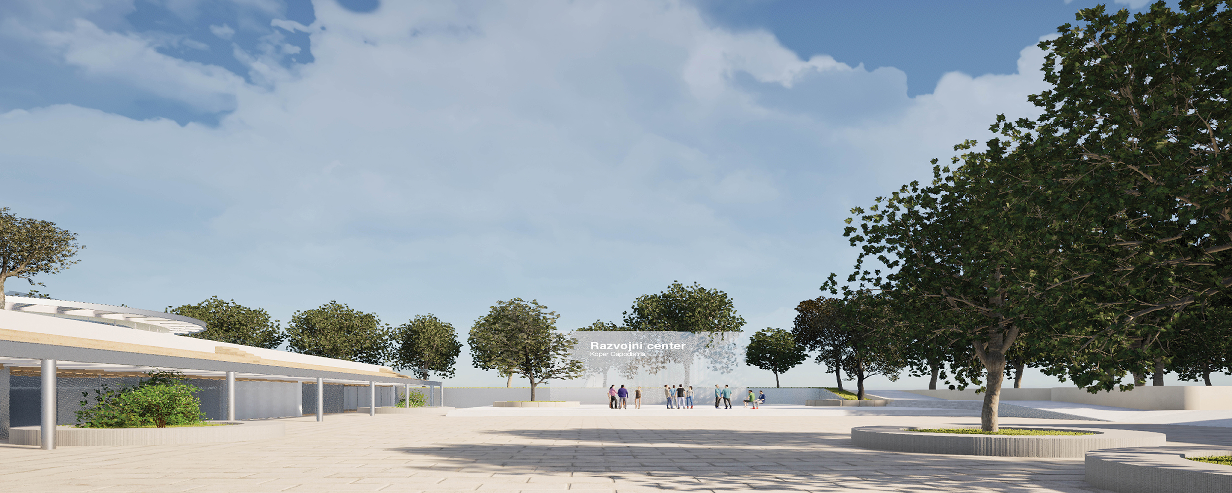 Mesto Koper je eno izmed pomembnejših mest v Sloveniji z odličnimi razvojnimi potenciali, zato si želi pridobiti tudi mednarodni vpliv. Magistrska naloga raziskuje možnosti doseganja takega razvoja ob hkratnem spreminjanju organizacije mest in družbe. Teoretična literatura omenja posledice razvoja naprednih tehnologij, ki spodbujajo praznjenje javnih prostorov, razpršitev in fragmentacijo grajenega z vse bolj individualizirano družbo. Rešitev se kaže v trajnih prizoriščnih javnih prostorih, ki so v mestu Koper že prisotni. V teh prostorih prevladujejo kulturne vsebine, ki pa dosegajo le regijski virtualni vpliv. V nalogi raziskujem priložnosti poslovnega programa, saj se je ta s teoretičnimi izhodišči in zgodovinskimi dogodki izkazal za glavnega nosilca napredka mesta, ter ga reinterpretiram v prizoriščni javni prostor. Arhitekturni predlog med drugim razrešuje tudi topografske specifike, degradiranost lokacije obsežnega parkirišča, umestitev večmodalnega centra in širitev parkovnih površin. Identificiranje razvojnega centra kot prizorišče mesta ob že prisotnih dogodkovnih lokacijah nakazuje prvo in pravo prizorišče, ki funkcionira kot sodobni javni prostor ter dosega nadnacionalna virtualna omrežja. Predlog predstavlja zagonrazvoja, produkcije, raziskovanja, izobraževanja in kakovosti bivanja. Razvojni center jepriložnost umestitve Kopra med pomembnejša globalna mesta.
